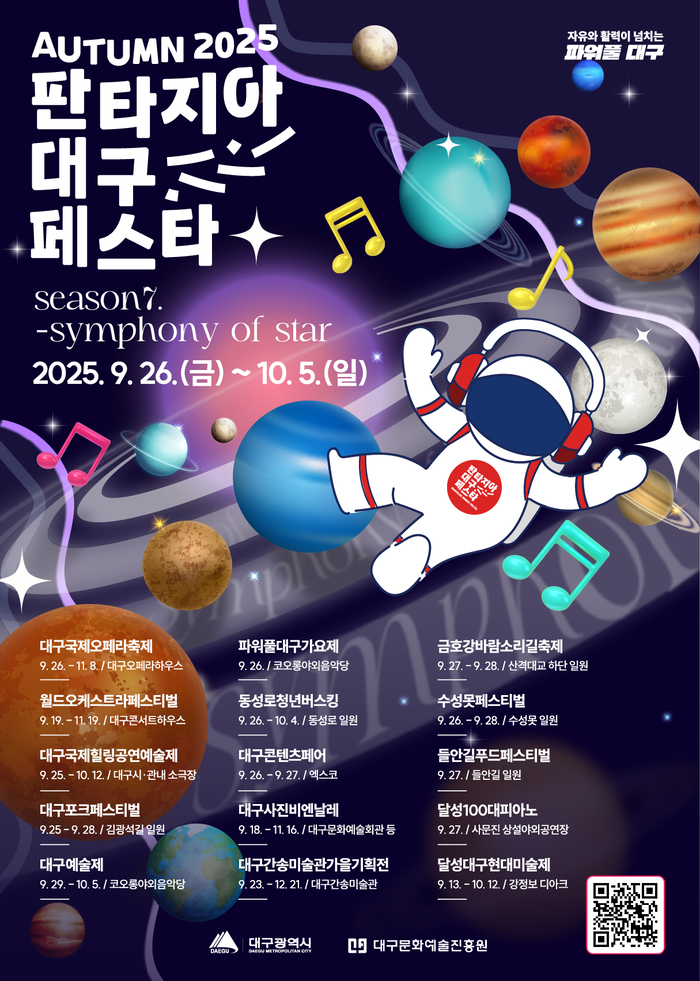 대구시가 주최하고 대구문화예술진흥원이 주관하는 이번 축제는 ‘Symphony of Star(별의 노래)’를 슬로건으로 가을의 서정과 공연예술의 감동을 선사할 예정이다. 올해는 음악,연극,무용,시각예술,미디어아트 등 장르를 넘나드는 풍성한 프로그램이 마련돼 대구 곳곳을 가득 채운다.
