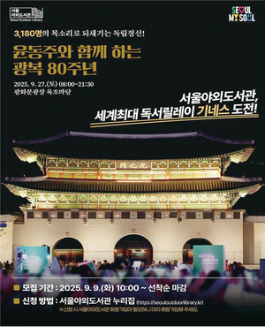 서울도서관 광복 80주년 기념 세계 최대 독서 릴레이 기네스북 도전(사진 서울시) ☞ 광복 80주년,윤동주 시인 서거 80주기에 맞춘 ‘독서 릴레이’서울시는 광복 80주년과 윤동주 시인 서거 80주기를 맞아 9월 27일(토) 광화문광장에서 시민들과 함께 ‘세계 최대 독서 릴레이(Largest Reading Relay)’ 기네스북 도전에 나선다. 독서 릴레이는 윤동주 시인의 유고 시집 『하늘과 바람과 별과 시』 전문을 시민들이 한 문장씩 이어 낭독하는 방식으로,문학으로 저항에 나섰던 시인 윤동주를 통해 광복 80주년이라는 역사적 의미를 되새긴다.현재 기네스북에 등재된 ‘독서 릴레이’ 세계 기록은 인도에서 『간디 자서전』을 낭독한 3,071명이다. 서울도서관은 광복 80주년,윤동주 서거 80주기의 의미를 담아 3,180명을 목표 인원으로 설정해 역사적 의미를 더했다. 또한 이번 도전은,문화 확산 모델을 선보인 서울야외도서관의 하반기 재개장과 함께 진행돼 시민들과 함께 특별한 독서 경험을 나눌 예정이다. ‘기네스북 독서 릴레이’ 모집 및 참여와 관련한 자세한 내용은 서울야외도서관 누리집과 공식 SNS를 통해 확인할 수 있다.[글 시티라이프부 이승연 기자 lee.seungyeon@mk.co.kr][사진 게티이미지뱅크,서울시,한국문화예술위원회,서울야외도서관,매경DB][본 기사는 매일경제 Citylife 제998호(25.09.23) 기사입니다]면책 조항 :이 기사는 다른 매체에서 재생산되었으므로 재 인쇄의 목적은 더 많은 정보를 전달하는 것이지,이 웹 사이트가 그 견해에 동의하고 그 진위에 책임이 있으며 법적 책임을지지 않는다는 것을 의미하지는 않습니다. 이 사이트의 모든 자료는 인터넷을 통해 수집되며, 공유의 목적은 모든 사람의 학습과 참고를위한 것이며, 저작권 또는 지적 재산권 침해가있는 경우 메시지를 남겨주십시오.