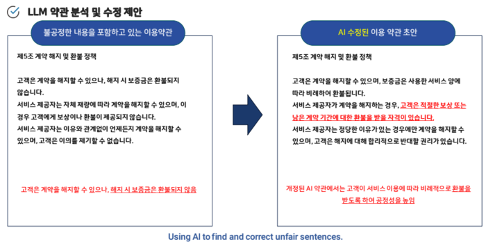 왼쪽은 불공정 조항,오른쪽은 환불 기준과 사용자 권리를 명시한 AI 수정안 예시 / 제공=미디어젠