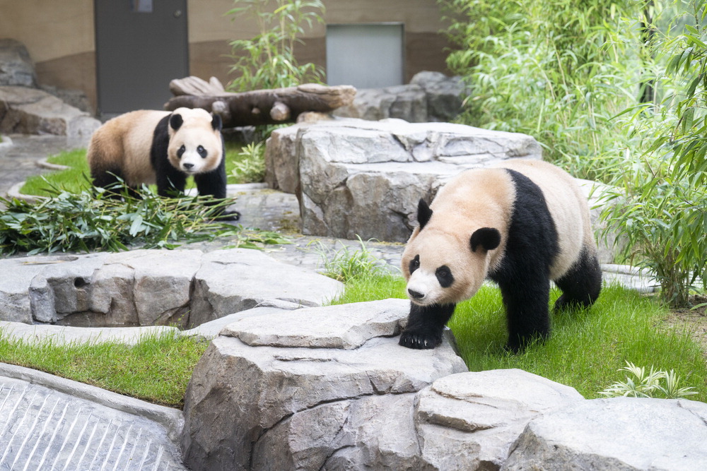 국내에서 태어난 최초의 쌍둥이 판다인 루이바오와 후이바오를 위한 새로운 보금자리가 다음달 3일 에버랜드에 문을 연다. 사진은 루이바오(오른쪽)와 후이바오가 판다 세컨하우스에서 지내는 모습. 삼성에버랜드