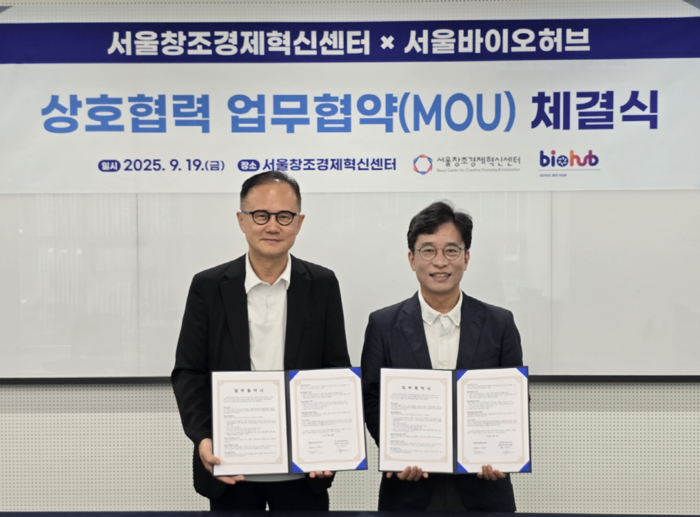 < 서울센터 이영근 대표이사와 서울바이오허브 김현우 단장이 지난 9월 19일 서울 용산 본사에서 업무 협약을 체결한 뒤 기념 촬영을 하고 있다 / 사진 제공 : 서울창조경제혁신센터 > 서울창조경제혁신센터(대표이사 이영근,이하 서울센터)는 지난 9월 19일,서울바이오허브(단장 김현우)와 오픈이노베이션 활성화 및 국내 우수 창업기업 발굴을 위한 업무 협약(MOU)을 체결했다고 밝혔다.