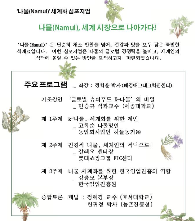주최 측은 이번 심포지엄을 통해 건강식의 대명사인 나물을 단순한 채소 반찬이 아니라 건강과 맛을 모두 만족시키는 특별한 식재료로서 세계인의 식탁에 올릴 수 있는 방안을 모색할 예정이다. 전문가들은 한국의 나물이 갖고 있는 영양학적 이점과 문화적 가치를 잘 살릴 경우 K푸드의 새로운 축으로 발전시킬 수 있을 것으로 보고 있다.