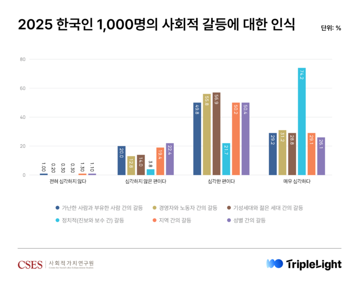 한국 사회의 갈등이 어느 때보다 심각한 상황이다. CSES와 트리플라잇이 공동 연구 및 발간한 ‘2025 한국인이 바라본 사회문제’ 연구보고서에 따르면,국민 10명 중 8명이 한국 사회의 갈등 수준이 심각하다고 평가한 것으로 나타났다. 이는 전국 성인남녀 1000명에게 성별,세대,지역,정치 성향,노사,소득 격차 등 6개 범주의 갈등 유형을 제시하고 국민들에게 그 심각성을 물어본 결과다.