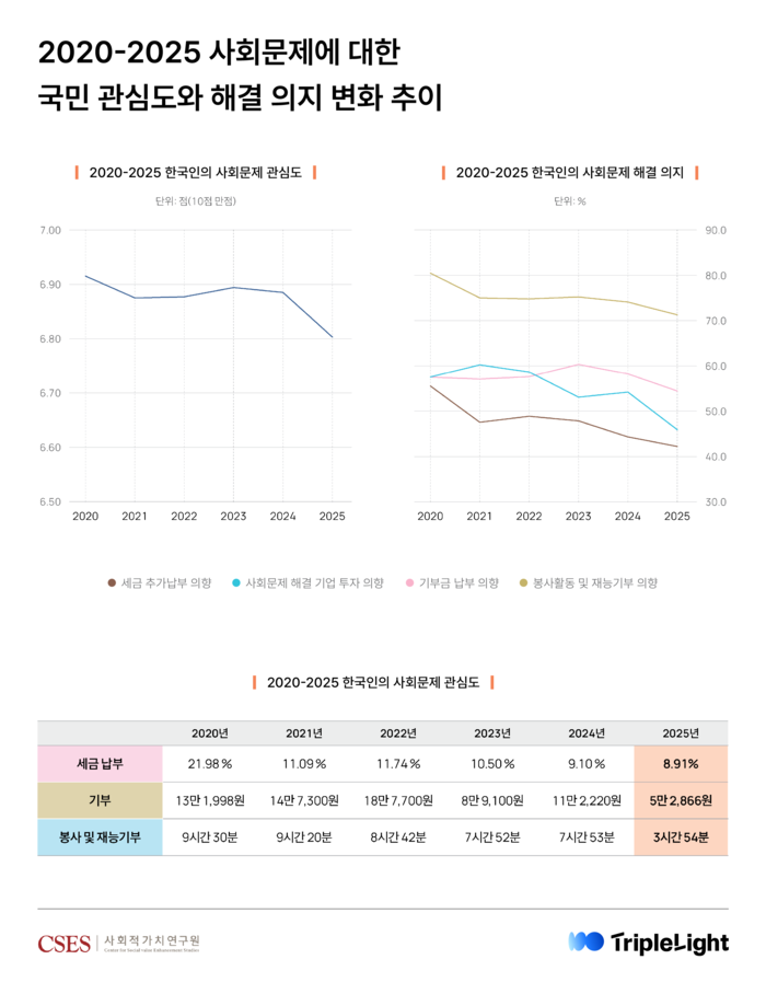 사회문제에 대한 전반적인 관심과 해결 의지는 감소세를 보이고 있다. [제공: 트리플라잇] 한편,사회문제에 대한 전반적인 관심과 해결 의지는 감소세를 보이고 있다. 사회문제에 대한 관심도는 2020년 6.92점(10점 만점)에서 2025년 6.8점(10점 만점)으로 하락했고,‘세금,투자,기부,봉사를 통해 사회문제를 해결하겠다’는 응답자 비중 또한 2020년 62.7%에서 2025년 53.5%으로 10%p 가까이 줄었다. 특히 올해 조사에서는 사회문제에 대한 관심이 높은 국민들조차 사회문제 해결 의지가 낮아진 것으로 나타났다. 2020년과 비교했을 때 특히 ‘사회문제 해결 투자 의향’(9.5%p 하락),‘봉사 및 재능 기부 의향’(5.4%p 하락)이 줄어든 영향이다.