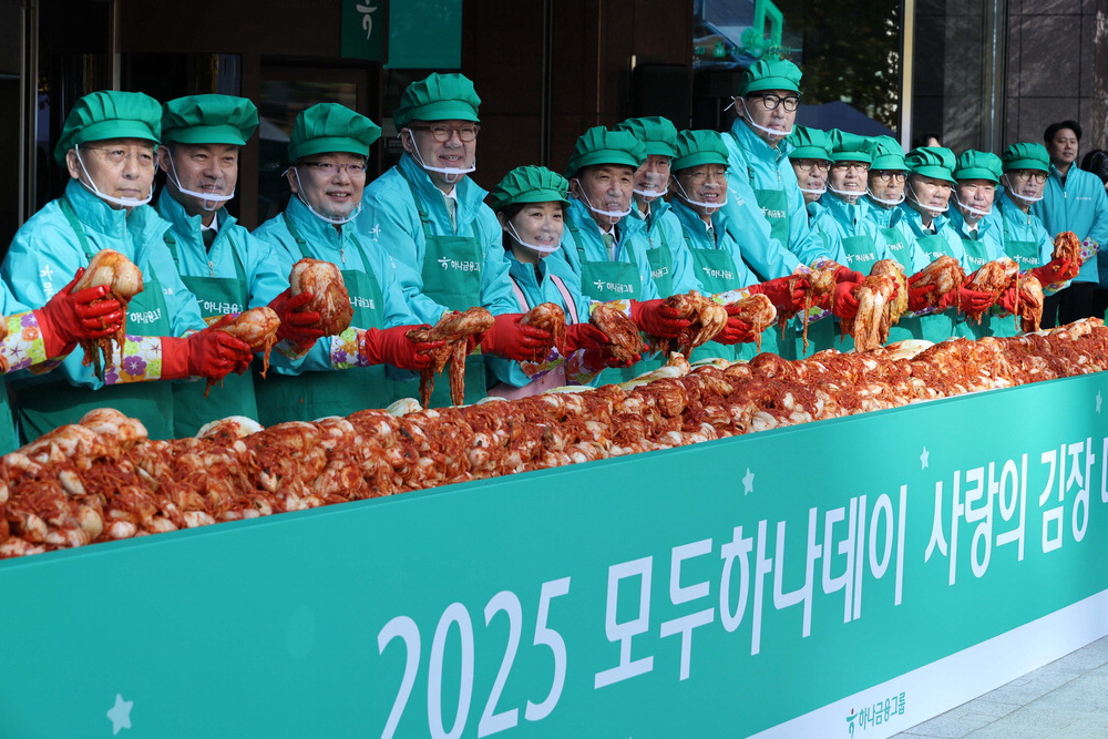 하나금융이 그룹 ESG(환경·책임·투명경영) 행사인 '2025 모두하나데이' 개최를 기념해 '사랑의 김장'에 나섰다. 10일 열린 행사에서 이호성 하나은행장,이은형 하나금융 부회장,김연길 하나가족사랑봉사단장,함영주 하나금융 회장,이승열·강성묵 하나금융 부회장,배성우 롯데웰푸드 본부장(왼쪽부터)이 김치를 담그고 있다. 한주형 기자