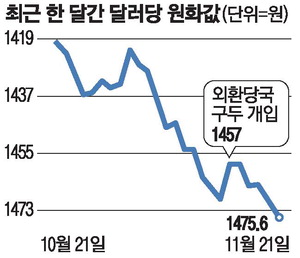 원화값 하락 추세가 고착화되면서 외환당국의 강력한 구두 개입성 발언의 효과도 미미해지고 있다는 평가가 나온다. 지난 14일 외환당국의 구두 개입성 발언과 실개입 추정 움직임이 나오면서 원화값은 일시적으로 1450원대를 회복했으나 이후엔 줄곧 하락세다. 이는 위험 회피 심리에 따른 달러 매수세가 워낙 강하기 때문인 것으로 풀이된다. 문정희 KB국민은행 이코노미스트는 "정부가 구두 개입 또는 실개입을 하더라도 결국 시장에서는 수급으로 환율이 결정되는 만큼 지금과 같은 강한 달러 수요를 반전시키긴 힘들다"고 설명했다.