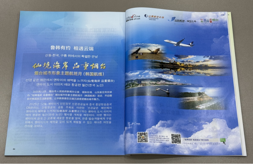 테마 항공편의 기내 TV에서 ‘세계여, 안녕! 나는 옌타이’ 한국어 마이크로 웹 홍보 영상을 상영해, 산둥–한국 상호 소통을 잇는 디지털 다리를 구축한다.