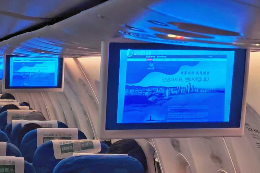 테마 항공편의 기내 TV에서 옌타이 도시 이미지 홍보 영상과 옌타이 선경같은 해안의 아름다운 풍광을 선보인다.