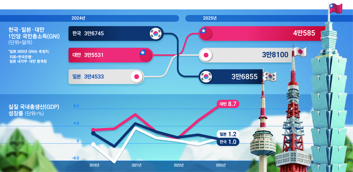반면 대만은 지난해 1인당 GNI가 4만585달러에 달했다. 2021년 3만달러를 돌파한 지 4년 만에 ‘3만달러 트랩’에서 벗어났다. 지난해 경제성장률 8.63%를 기록한 대만은 올해 1인당 GNI를 4만5273달러로 내다보고 있다. 한국은 일본에도 역전을 허용했다. 2024년 3만4533달러였던 일본의 1인당 GNI는 지난해 3만8100달러 안팎을 기록한 것으로 추산된다. 한국의 1인당 GNI는 2023년과 2024년에 일본을 앞선 바 있다.