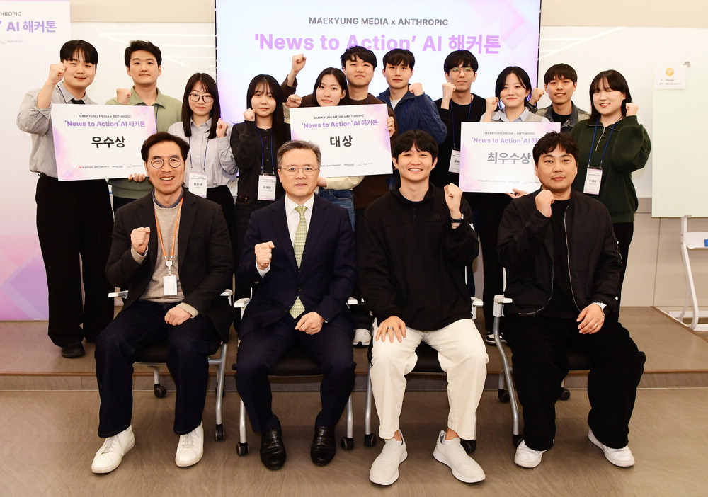 매경미디어와 앤스로픽이 공동 주최한 '뉴스 투 액션' AI 해커톤에서 위정환 매일경제신문 대표(앞줄 왼쪽 둘째)와 심사위원,수상 팀들이 기념촬영을 하고 있다. 강영국 매경AX 기자
