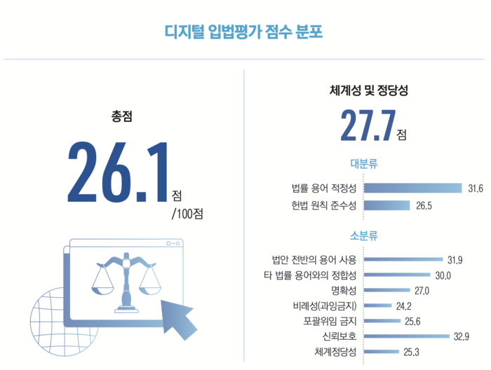 인터넷기업협회가 발간한 ‘2025 인터넷산업규제 백서’ 속 디지털 입법평가 점수 [출처 = 인터넷기업협회] 국내 디지털 산업에서 온라인플랫폼법과 같이 장기화되는 규제 논의가 기업들의 신사업 축소 등 경영에 부정적인 영향을 미친다는 분석이 나왔다.