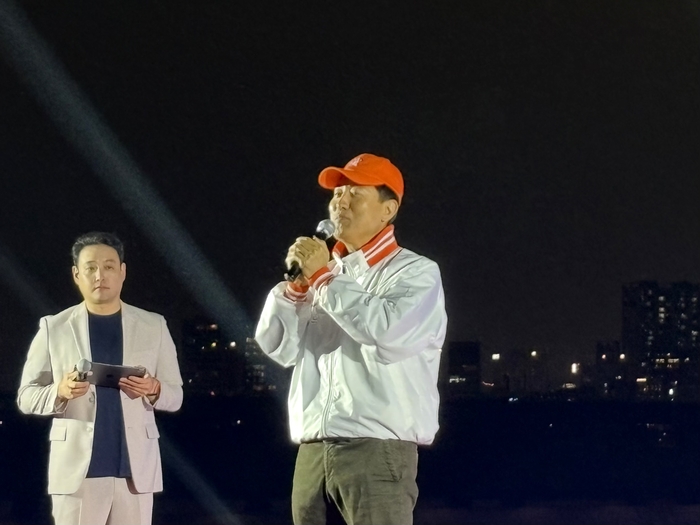 드론라이트쇼에 등장한 오세훈 서울시장/사진=김지은 여행+ 기자 드론쇼에 앞서 오세훈 서울시장이 깜짝 등장했다. “여러분 서울이 많이 재밌어졌죠?”라고 운을 띄운 오 시장은 “365일 즐거운 서울을 만들기 위해 노력하겠다”고 말했다.
