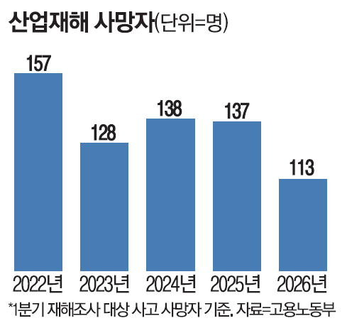 14일 고용노동부에 따르면 2026년 1분기 재해조사 대상 사고 사망자는 113명(98건)으로 전년 동기 137명(129건) 대비 24명 줄었다. 17.5% 감소한 것이다. 2022년 통계 작성을 시작한 이래 1분기 기준 최저치다. 재해조사 대상 사망 사고 통계는 산업현장에서 발생한 근로자 사망 사고 중 사업주의 ‘법 위반 없음’이 명백한 경우를 제외하고 집계된다.