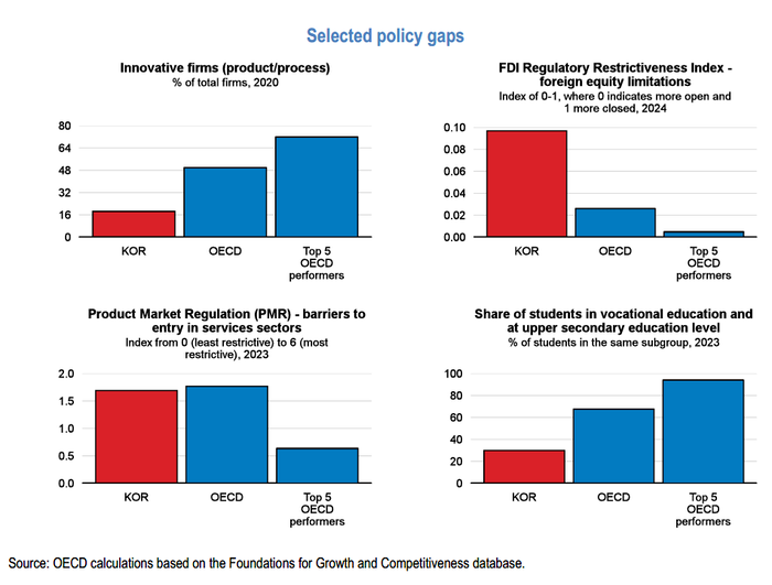 혁신을 위해서는 규제도 대폭 손질해야 한다고 밝혔다. OECD는 “한국은 서비스 및 네트워크 부문에서 무역장벽과 국가 개입을 완화할 여지가 충분하다”며 “경쟁이 심화하면 중소기업의 진입과 확장이 촉진되고,국내 기업이 지배하는 시장에서도 성장을 촉진할 것”이라고 강조했다.