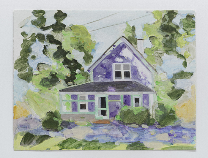 모린 갈라스의 ‘Summer Porch’(2025) <글래드스톤> 이 정제 과정에서 작가의 작업은 구상과 추상의 경계에 놓이게 된다. 화면 중앙에 집이나 꽃을 배치하고 주변을 하늘이나 풀잎으로 둘러싸는 특유의 공식을 사용하면서도,집의 문과 창문을 지워버리거나 인물을 철저히 배제한다. 인물이 사라진 빈 풍경은 특정 장소의 기록을 넘어 관람자의 기억이 개입될 수 있는 보편적인 공간으로 확장된다.