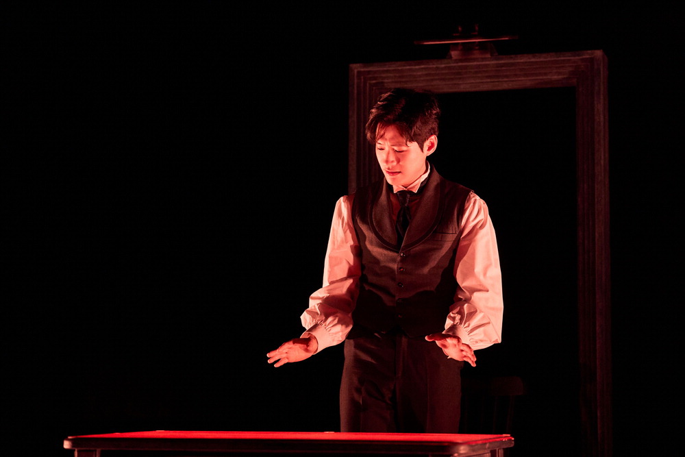 연극 '지킬 앤 하이드'에서 어터슨 역으로 출연하는 배우 정동화. 그는 다양한 소품을 활용해 1인 다역을 선보인다. 글림아티스트